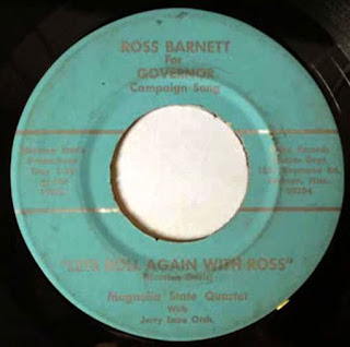 In 1967, Barnett ran for governor again but finished fourth in the Democratic Primary. He still had catchy songs. The chorus of "Let's Roll Again With Ross" goes: "Who is the best man yet? Ross Barnett! Ross Barnett! Who is the best man yet? Ross Barnett you bet!" He takes on President Lyndon Johnson and Robert Kennedy: "All left wingers stay away from me / we don't need your Great Society / in Mississippi we just want our sovereignty / Roll with Ross, roll with Ross, roll again with Ross....All the reds in Washington will say / they hope Ross will fall along the way / but we won't give our state to little Bobby K."
